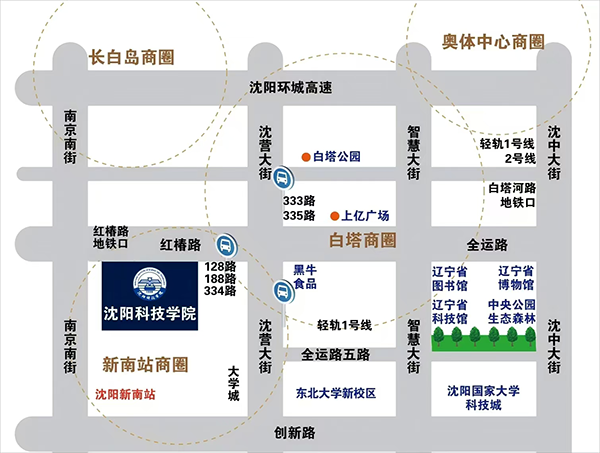 学校紧邻地铁四号线、轻轨和多条公交线路,距离沈阳南站仅10分钟车程,距离桃仙机场半小时车程,交通十分便利。