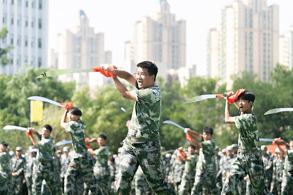 党委书记、军训团政委耿乃国宣布军训汇报展演开始。校长、军训团团长宋吉鑫依次检阅各营方队。