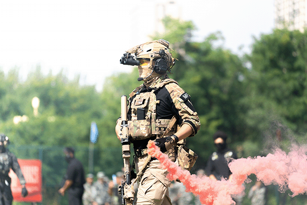 在各科目汇报表演中,全体参训学员以伟大抗战精神和伟大抗美援朝精神为引领,全面融入思想政治教育和爱国主义教育。刺杀操、匕首操、擒敌拳、破风八刀、倒功格斗等表演刚劲有力,气势如虹,胜利荣光字形、图案变换、破风八刀、战术演练与战场救护等特色项目惊艳全场,充分展现了入学以来的训练成果和新时代大学生的蓬勃朝气。